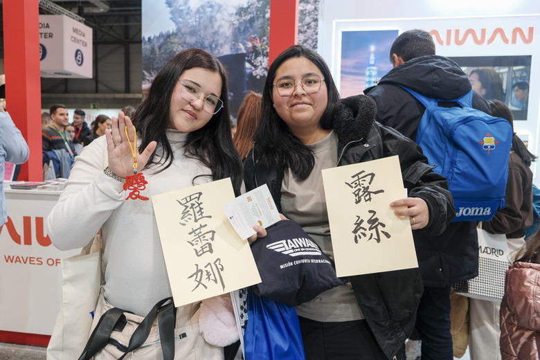 西班牙馬德里國際旅展,台灣館邀請書法老師坐鎮揮毫訪客中文名字,吸引來自西班牙與秘魯的同志情侶前來體驗,進而認識台灣文化與故事。(中央社記者胡家綺馬德里攝)