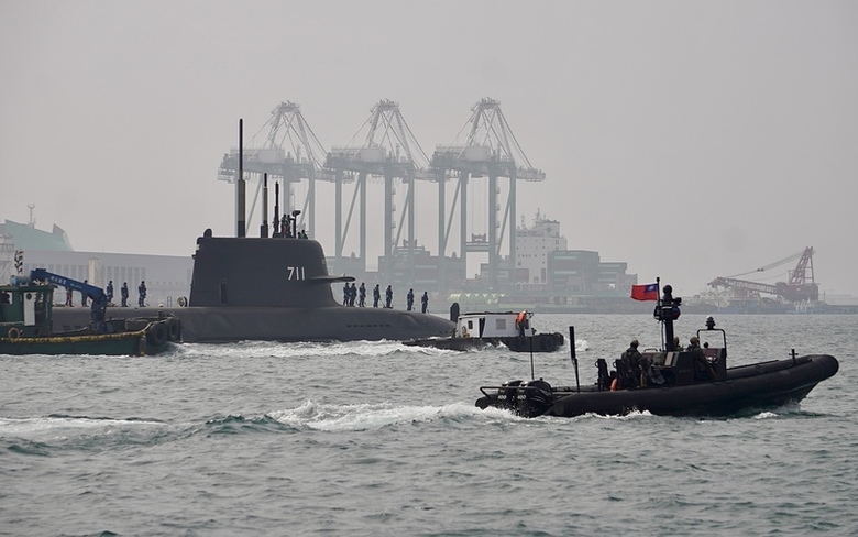 潛艦國造原型艦「海鯤號」26日在軍方快艇伴陪下,第6度出海測試。(中央社記者董俊志攝)