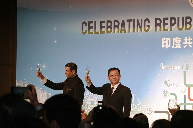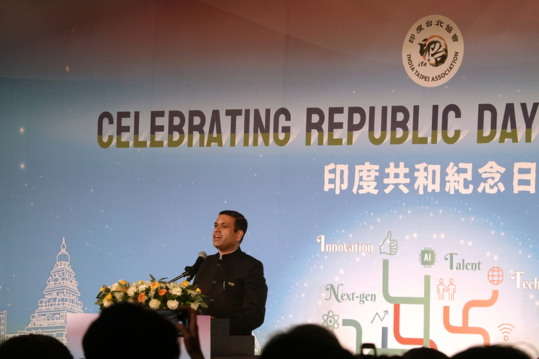 印度台北協會晚間舉辦「印度共和紀念日酒會」,由印度台北協會會長德寧瀚(Ninad Deshpande)主持,行政院政務委員楊珍妮、勞動部長洪申翰、外交部常務次長葛葆萱、朝野立委以及多國駐台使節代表出席與會。