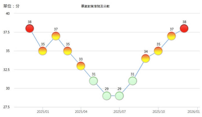 國發會指出,2025年12月景氣對策信號綜合判斷分數為38分,月增1分,燈號轉呈紅燈。