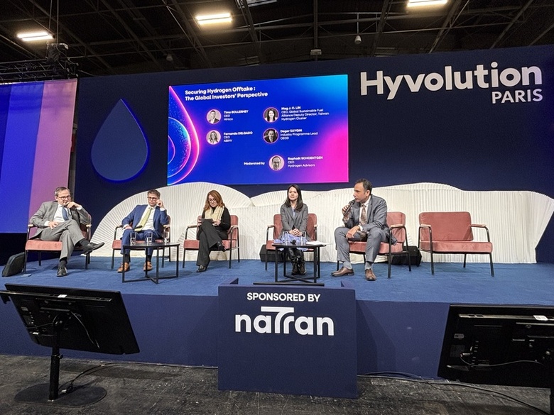 中央大學氫能研究中心副主任林若蓁(右2)27日出席巴黎氫能展座談,與來自經濟合作暨發展組織(OECD)、巴西等數名專家從投資角度觀察產業發展。(中央社記者曾依璇巴黎攝)
