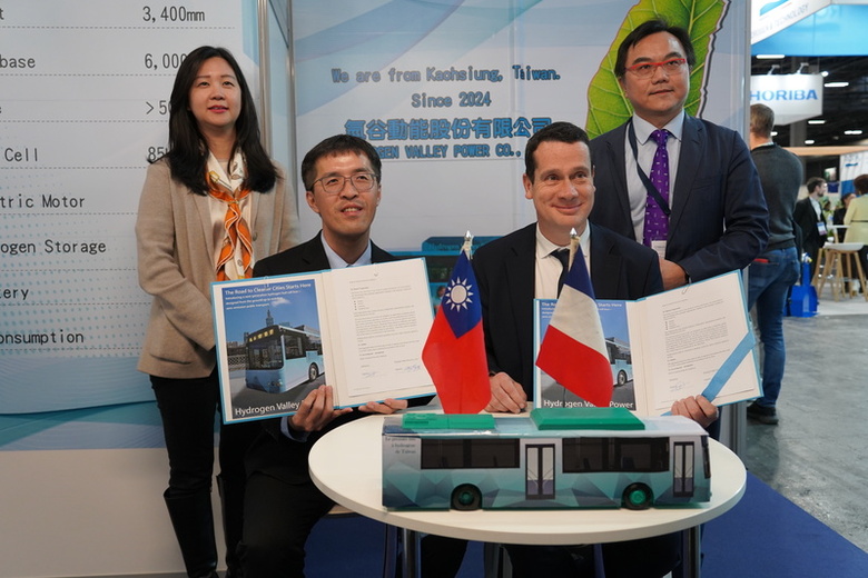 氫谷動能執行副總經理謝耀霆率團參加巴黎氫能展(Hyvolution Paris),27日與OPmobility歐洲區總經理彭雄(Xavier Ponchon)簽署共同開發國際市場合約,駐法國台北代表處經濟組組長吳嘯吟、巴黎台灣貿易中心主任林君憶、中央大學氫能研究中心副主任林若蓁及法方多人在場見證。